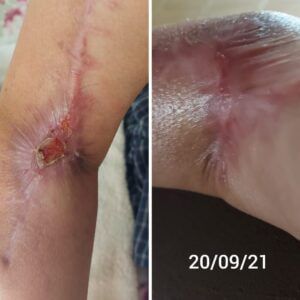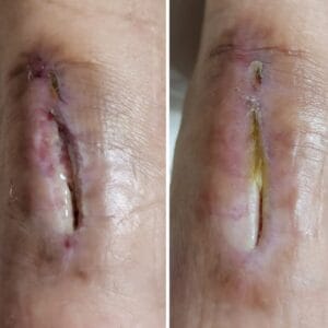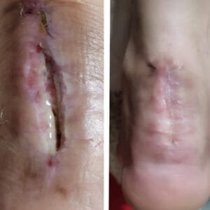 Paciente joven, con cirugía fallida de rotura de tendón, herida que llevaba 6 meses de evolución, acudió a la Clínica Varizmed y obtuvimos un excelente resultado.